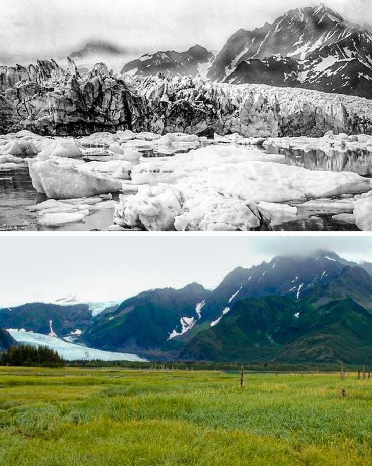 1. Льодовик Петерсена на Алясці, сотню років тому й сьогодні.