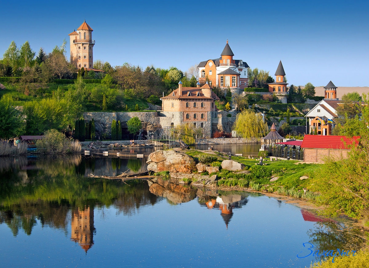 На 3 га спочатку розташований храмовий комплекс з дзвіницями і розбитий парк з кам’яними скелями і водоймами, підводним мостом, маєтком власника з цікавою архітектурою, скульптурами з дерева, мармуровими статуями. Красується тут відомий фонтан, який був раніше встановлений на Майдані Незалежності в Києві. А поруч з працюючим фонтаном встановлено багато лавок, розміщені оригінальні композиції, серед яких є Алея казок для дітей.