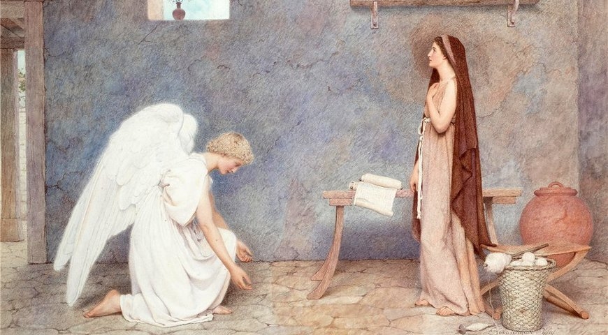 В Євангелії від Луки сказано, що після того, як Марія заручилася з Йосипом, до неї в Назарет з благою звісткою прийшов архангел Гавриїл. Він сповістив її, що Святий Дух чудесним чином зійшов на неї, і Діва в утробі носить Сина Божого. Одним із символів Благовіщення є білі голуби на блакитному небі, оскільки ці птахи уособлюють приємну новину.