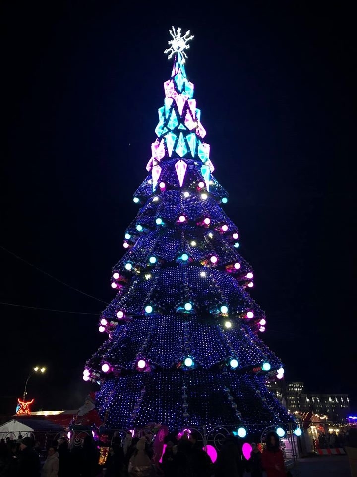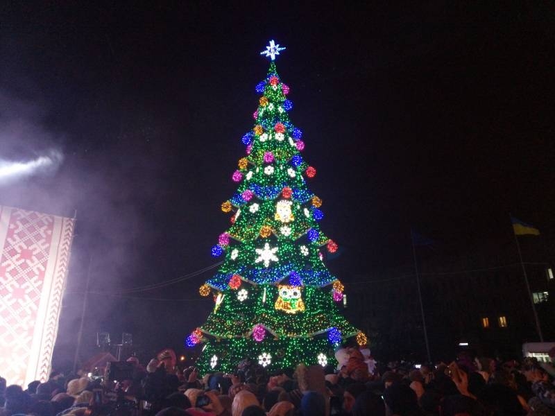 "Штучне" новорічне дерево прикрашає місто вже 8 років поспіль. Винятком був лише 2013 рік – тоді ялинка була живою. Висота штучної красуні 18,5 м. Цього року ялинку прикрасили різнокольоровими кульками українського виробництва.