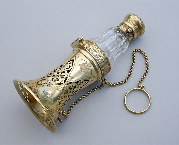 За часів, коли дами затягували свої талії в жорсткі корсети, така ємність була не примхою, а необхідністю. У цій красивій баночці на ланцюжку, жінки носили нюхальну сіль. Її вони непомітно вдихали в момент, коли відчували, що ось-ось втратять свідомість.